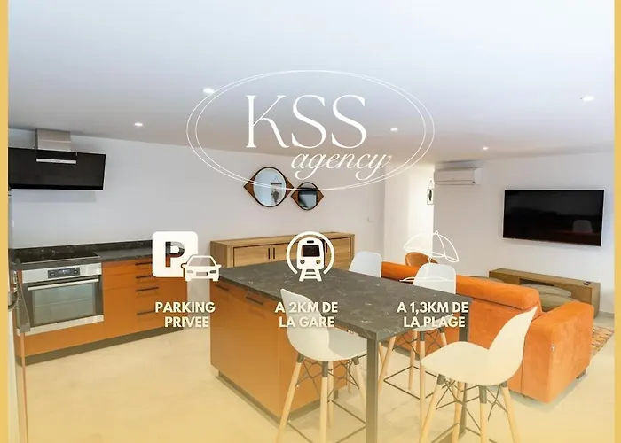 広々とした80m²のAppart Hotel 2 Chambres - Cuisine - Parking Saint-Raphaëlはテラスがあり、ル・リオン・ド・メールかなり近くに位置しています。